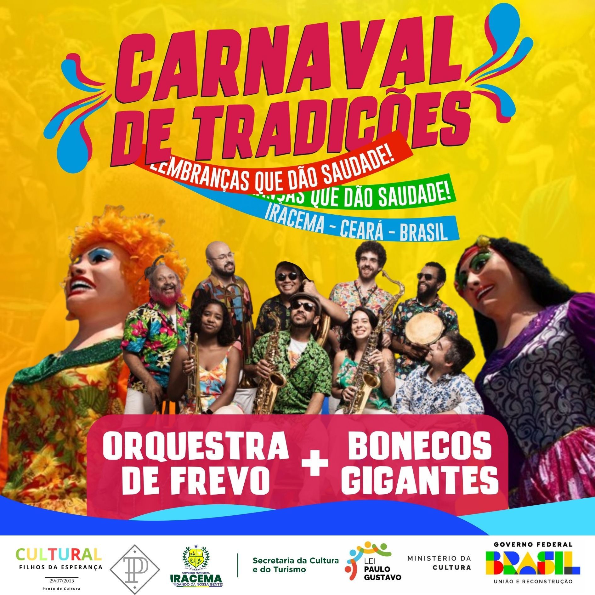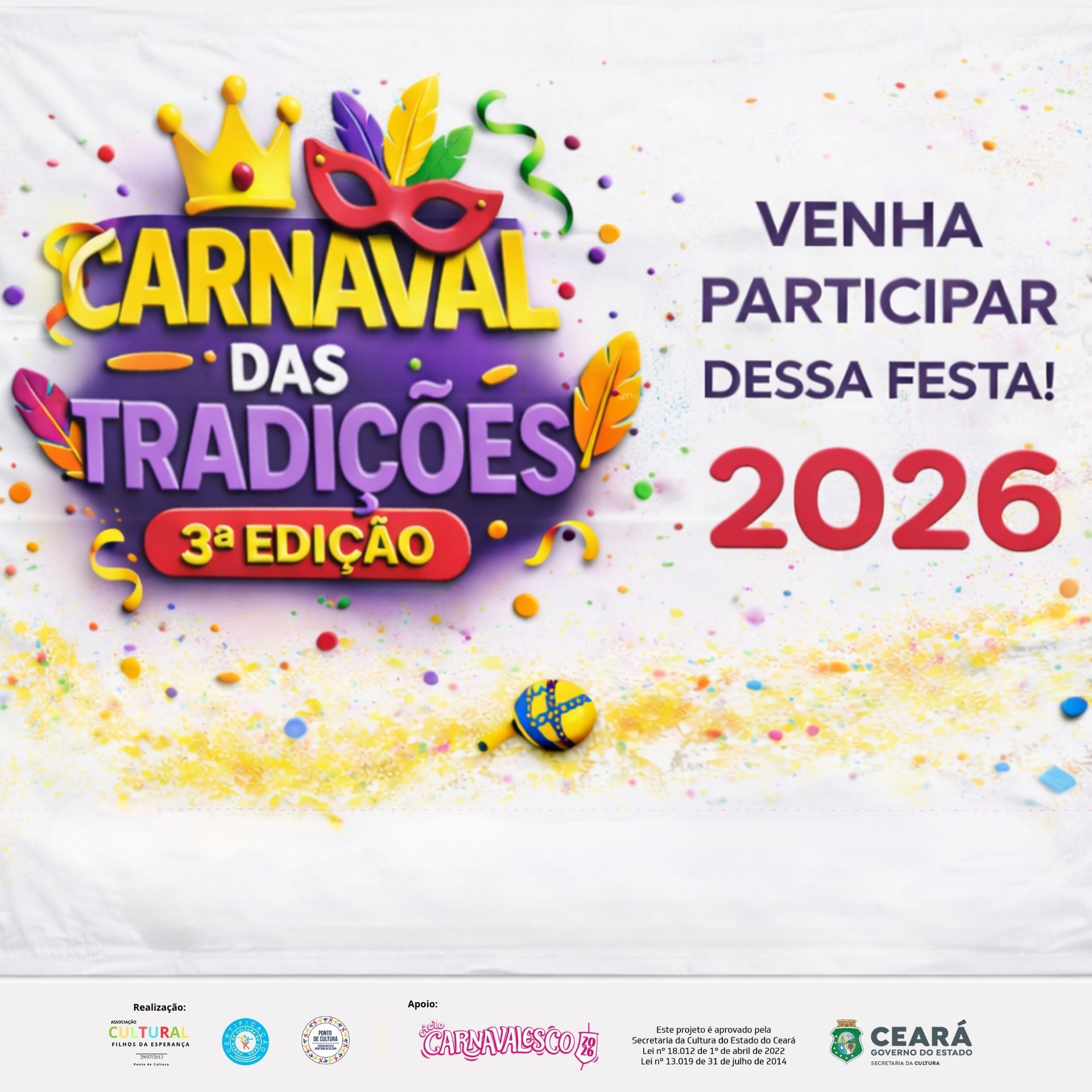PROGRAMAÇÃO CULTURAL Carnaval das Tradições – 3ª Edição (2026) Dia 12 de fevereiro - Baile Popular (Pré-Carnaval) 08h - Matinê da Terceira Idade • Baile com marchinhas e músicas tradicionais de carnaval. • Brincadeiras adaptadas para o público idoso. • Concurso do Rei Momo e Rainha da Terceira Idade. • Parceria com a Secretaria do Trabalho e Assistência Social para integração e acolhimento. 18h – Cortejo de Carnaval • Saída da Rua Capitão Manuel Rufino de Negreiros, passando pelas principais ruas da cidade. • Animação com Orquestra de Frevo e blocos de rua. • Participação de foliões fantasiados, bonecos gigantes e grupos tradicionais. A partir das 19h às 22h – Baile do Carnaval das Tradições (Praça da Índia) • Shows musicais com bandas locais e regionais. • Concurso do Rei Momo e Rainha do Carnaval 2026. • Feira Gastronômica e Artesanal, com participação de pequenos empreendedores e Mestres da Cultura. • Espaços de pintura facial, e confecção de máscaras e adereços carnavalescos. • Encerramento festivo com grande baile popular (previsão de 5h de programação).   Dia 13 de fevereiro - Matinês no Ginásio Poliesportivo de Iracema 08h às 11h – Matinê Infantil • Oficinas de máscaras e adereços carnavalescos. • Pinturas faciais e brincadeiras lúdicas (dança das fitas, estátua carnavalesca). • Desfile de fantasias infantis. • Guerra de confetes e serpentinas. • Concurso do Rei Momo e Rainha Mirim do Carnaval das Tradições 2026. • Espaços de pintura facial, e confecção de máscaras e adereços carnavalescos.